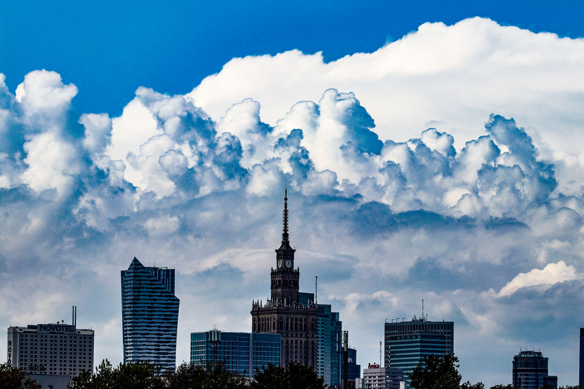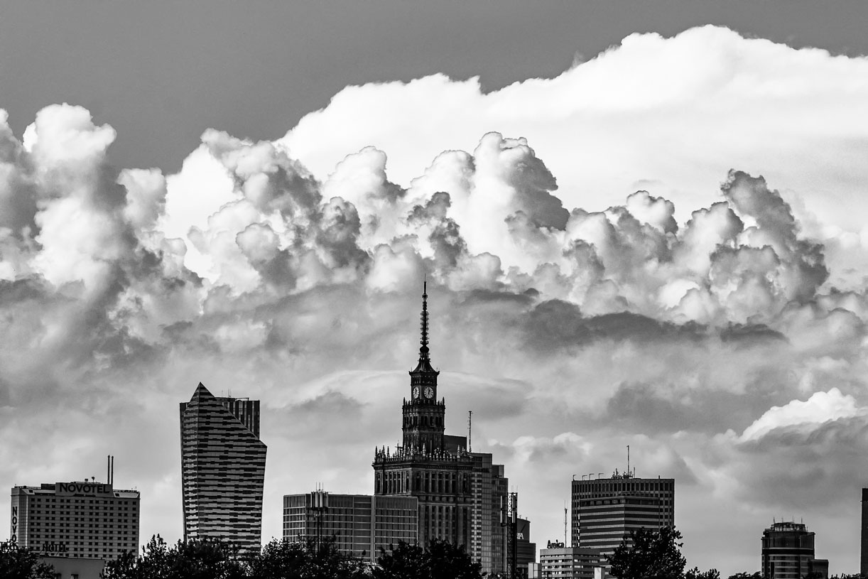 Niezwykłe chmury nad iglicą PKiN w Warszawie. Fotografia czarno biała. Black and white photography.
